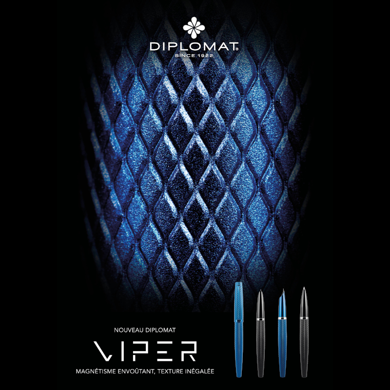 La nouvelle série présente un corps entièrement guilloché avec un motif complexe rappelant les écailles d’un reptile, offrant un aspect distinctif et captivant. Le design épuré du stylo est complété par une plume soigneusement conçue, garantissant une expérience d’écriture fluide et sans effort. Malgré son apparence haut de gamme, le Diplomat „Viper“ est conçu pour offrir un rapport qualité-prix exceptionnel, le rendant accessible aux passionnés comme aux professionnels à la recherche d’un instrument d’écriture de haute qualité.