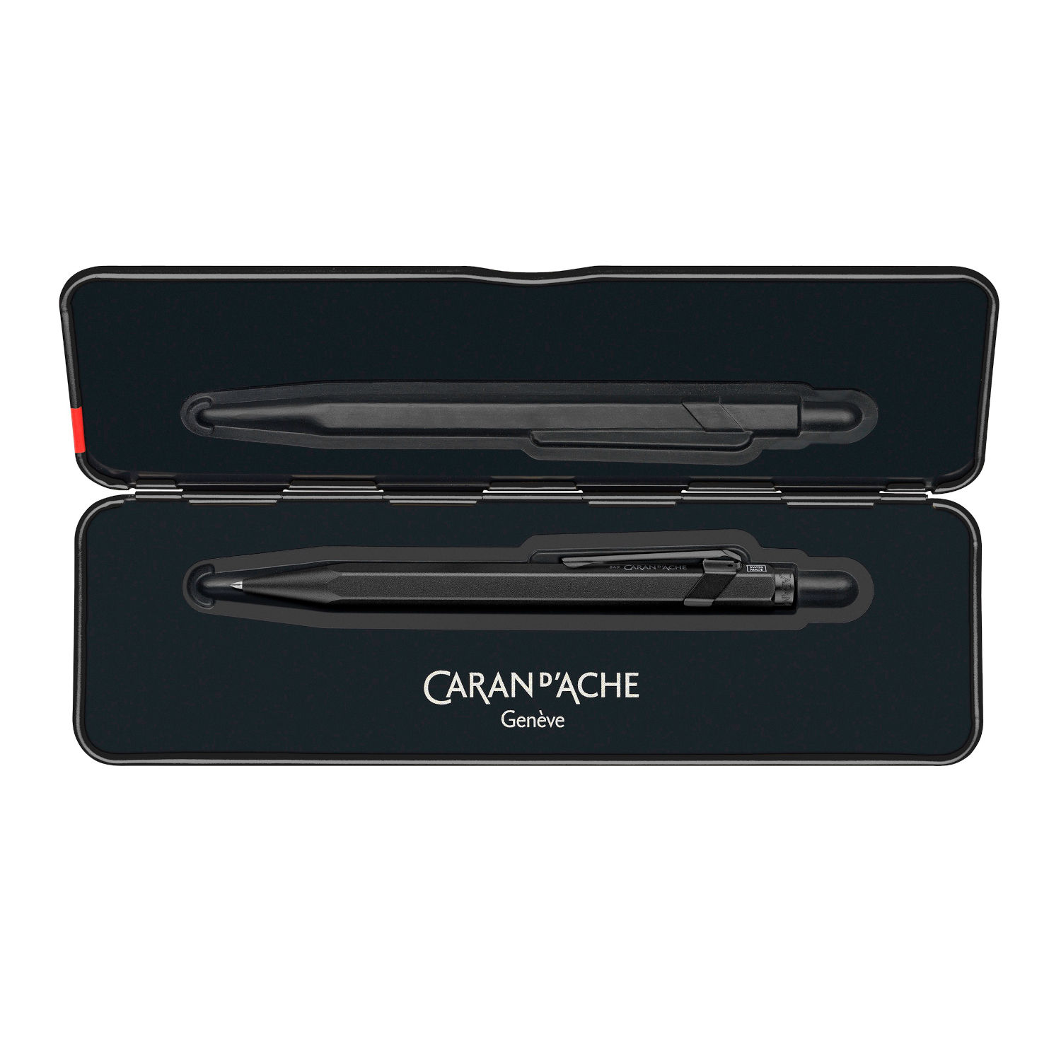 Slimpack vernis noir standard avec logo Caran d’Ache blanc à l’intérieur et à l’extérieur