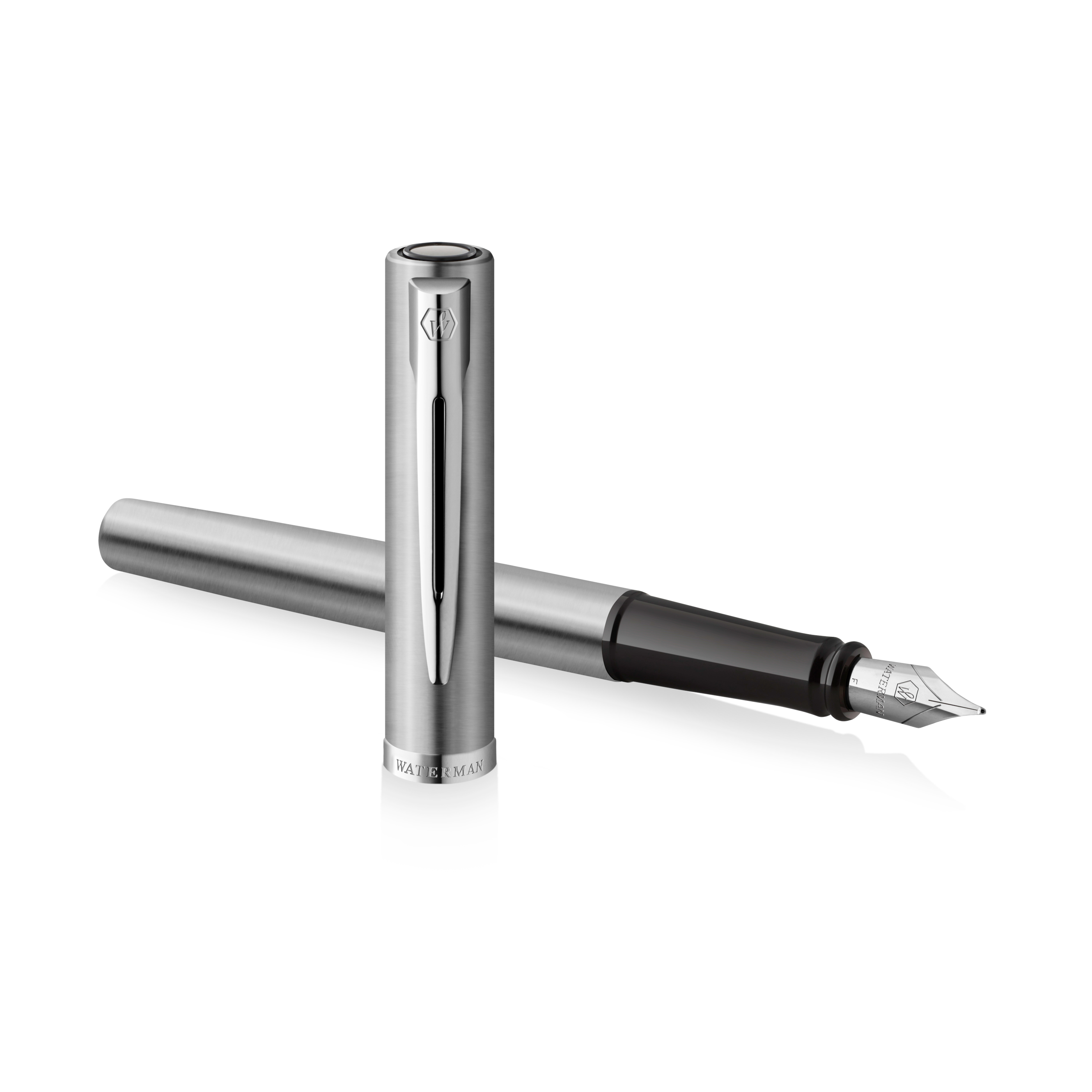 - Une silhouette élégante dotée d’un corps et d’un capuchon rehaussés d’une finition en acier inoxydable brossé. Le clip Waterman emblématique à double branche et un large anneau plaqué palladium sur le capuchon confèrent une distinction raffinée à ce magnifique instrument d’écriture.