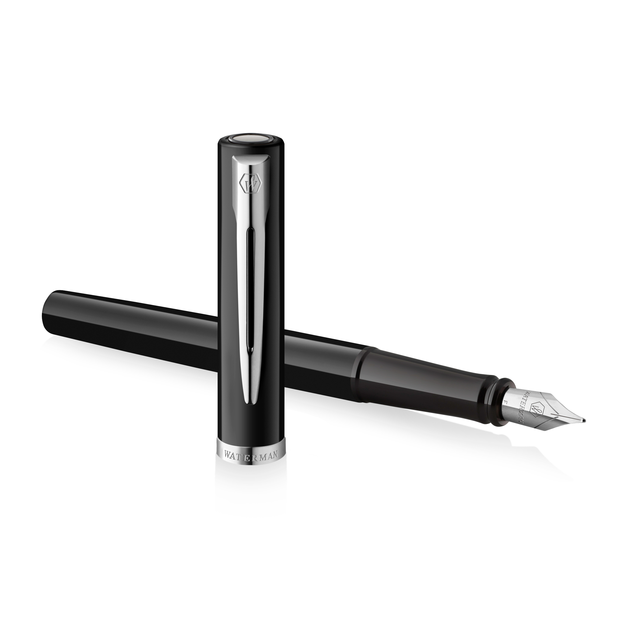 - Une silhouette élégante dotée d’un corps et d’un capuchon rehaussés d’une finition laquée noire brillante. Le clip Waterman emblématique à double branche et un large anneau plaqué palladium sur le capuchon confèrent une distinction raffinée à ce magnifique instrument d’écriture.